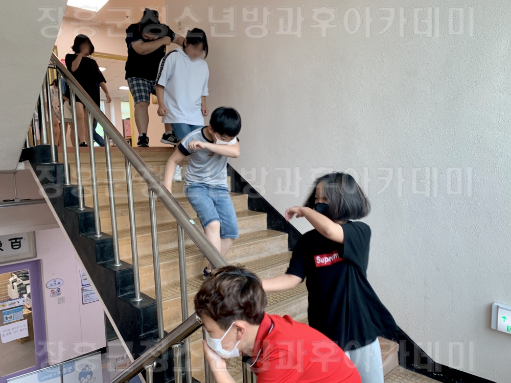 ○일시 : 2020.06.26.(금) 16:00~17:00 ○장소 : 청소년수련관 2층 하랑반 교실 및 야외대피소 ○내용 -보충학습 시간을 이용하여 동영상 시청과 나누어준 안전매뉴얼을 읽고, 화재 시 학생 행동요령 및 소화기 사용법을 익힌 후, 실제 상황을 가상하여 화재 시 신속한 대피와 함께 주차장에 모여 인원파악 후 훈련을 종료하였습니다.