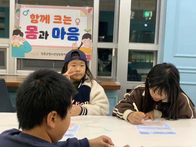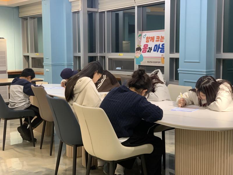 ○내용: 장흥군청손년상담복지센터와 연계하여 초등반은 스트레스 지수 검사로 진행하였고 중등반은 특별 강사님을 모시고 성폭력에 대하여 이야기를 나누는 방식으로 진행하였다.