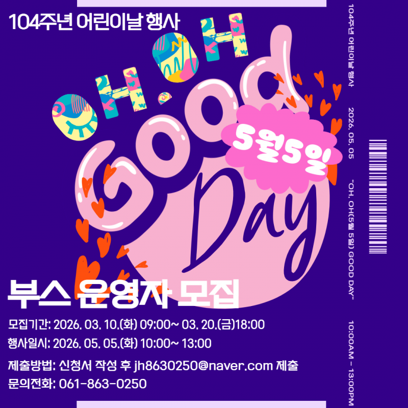 2026 장흥군 어린이날 행사 일반 체험 부스 운영자 모집 공고 (3/10 ~ 3/20)